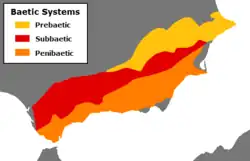 Osiową strefę (pd.) stanowi krystaliczny masyw Sierra Nevada, ze szczytem Mulhacén, 3479 m n.p.m. (najwyższym na Półwyspie Iberyjskim i w europejskiej części Hiszpanii). Strefa zewnętrzna (pn.) jest zbudowana ze skał osadowych (mezozoiczne wapienie, margle, piaskowce i dolomity). Strefy te są rozdzielone pasem obniżeń wypełnionych osadami trzeciorzędu i czwartorzędu i silnie rozczłonkowane przez podłużne i poprzeczne uskoki oraz pęknięcia. Przeważające wysokości mieszczą się w granicach 1500–2000 m n.p.m. Są to góry o stromych stokach.
