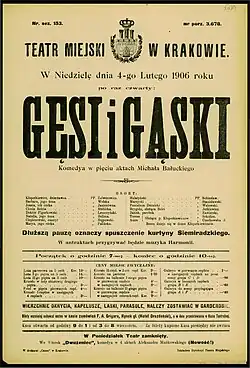 - ↑ L. K., Pierwsze przedstawienie komedyi w 5ciu aktach M. Bałuckiego "Gęsi i gąski", „Czas”, R. 32 (nr 250), 14 listopada 1882, s. 3 [dostęp 2023-11-23].
