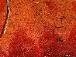 O grubości do 2 cm, cynobrowego koloru, elastyczny, włóknisty i bez zapachu[5].