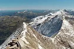 Z doliny górskiej, Engadyna (przez Inn do Dunaju) Główny grzbiet Alp dzieli charakterystyczne środkowe wypaczenie na południu z całymi Alpami. W Alpach Zachodnich zmienia Główny łańcuch Alp przez wielokrotnie ujmujące duże doliny, od strony francuskiej, od zachodu stoki, w kierunku do włoskiego Piemontu (Valais/Rodan, Dolina Aosty/rzeka Pad, Isère/Vallée de la Tarentaise, Maurienne/Rodan, Dora Riparia/rzeka Pad i Durance/Rodan) i kieruje się potem na wschód do centralnego działu wodnego Apenin. W Alpach wschodnich biegnie w kierunku zachodnim i wschodnim, rozszerza się nad około 200 kilometrów, w kierunku terenu górskiego.