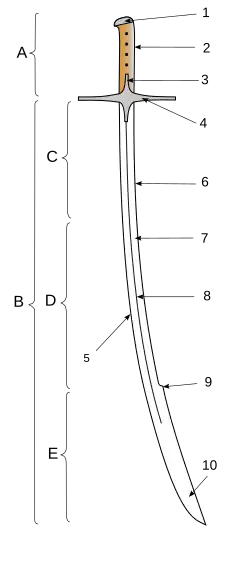 Według niemieckich traktatów szermierczych z XIV i XV w. głownia dzieliła się na dwie podstawowe części: