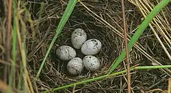 - Samica składa 4–6 białawych, czarno kreskowanych i pokrytych nieregularnymi liniami jaj.