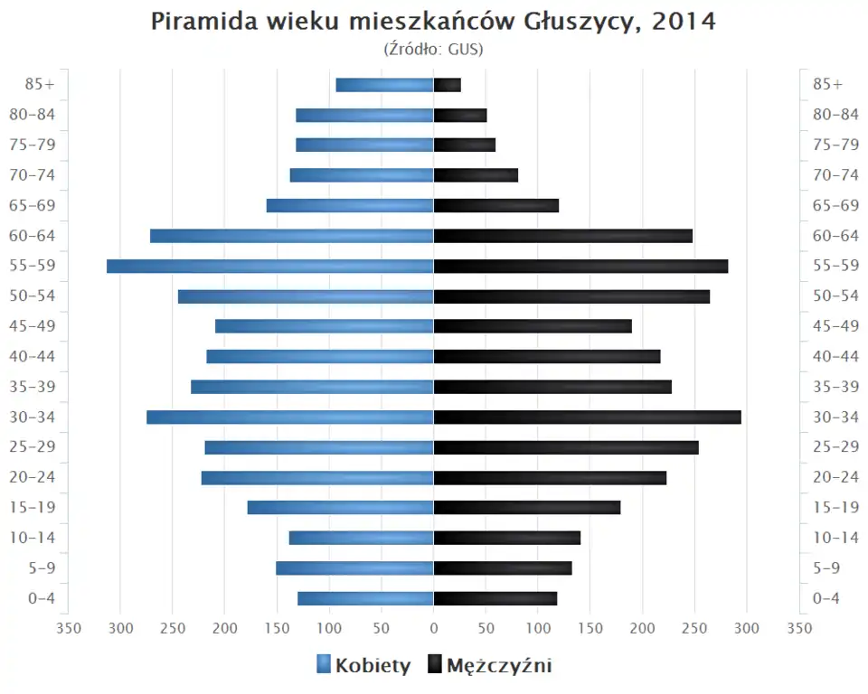 Piramida wieku mieszkańców Głuszycy w 2014 roku[10].