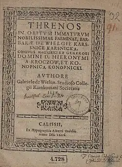- ↑ Krzysztof Tomasz Witczak, Łacińskie treny Gabriela z Wielunia na śmierć Barbary z Karśnickich Konopnickiej (1606), [w:] Blisko i daleko. Sympozjum regionalistów - Praszka 2018, Wieluń-Praszka: Wieluńskie Towarzystwo Naukowe, 2019, s. 30–32.