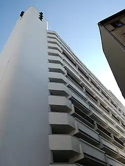 Charakterystycznym elementem budynku są cztery wieże wyraźnie wyodrębniające się i dominujące w bryle budynku mieszkalnego[32][36][56], w których mieszczą się pionowe ciągi komunikacyjne, kontrastujące z poziomymi podziałami fasady wynikającymi z ukształtowania galerii komunikacyjnych[32]. Duża część elewacji pomalowana jest na kolor biały[56].