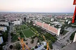 Między mieszkalnym wieżowcem a pawilonami usytuowano trakt komunikacyjny długości ponad 200 m i szerokości około 10 m[57]. Wysokość budynków handlowo-usługowych i biurowego liczba kondygnacji określona jest na dwie[46][50][55].