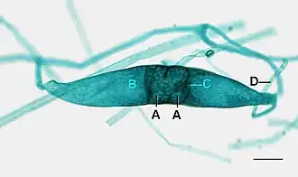 A – gametangium, B – przegroda, C – włostek, D – strzępka. Kreska pod rysunkiem ma długość 0,1 mm