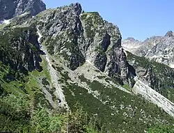 - Ma ukośną podstawę. W jej skrajnie prawej części jest co jakiś czas odnawiający się obryw. Z lewej strony ściana ograniczona jest północno-wschodnim filarem. W górnej lewej części ściany jest kocioł Pająk (Pavúk) ze stromym dnem zarośniętym łopianami. Opada do niego pionowy komin z najwyższej części opisanego filara. W ścianie i filarze jest kilka dróg wspinaczkowych[2]: