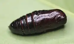 Gąsienica charakteryzuje się obecnością dwóch lekko odgiętych, mięsistych garbów zlokalizowanych na grzbietowych częściach segmentów ciała piątego i szóstego. Ubarwienie gąsienicy jest zmienne. Brak jest u niej ciemnych tarczek nad stopami[4].