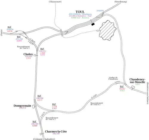 stacja Toul leży na linii Paryż - Strasburg (linia nr 1 Wschód) na końcu linii z Culmont-Chalindrey (linia 15) i na linii do Blainville-Damelevières (linia 27).