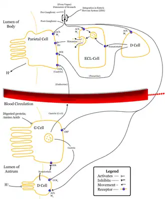 - stymulacji nerwów błędnych, gdzie neurotransmiterem jest GRP (acetylocholina działa pośrednio na komórki D)