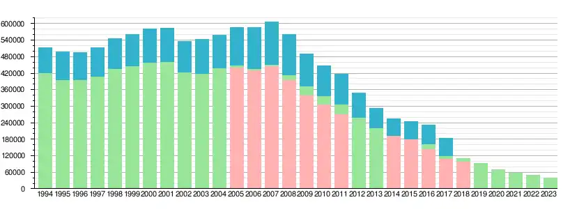 Średni nakład jednorazowy (niebieski), całkowite rozpowszechnianie płatne (zielony) i sprzedaż ogółem (różowy)