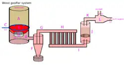 Gorący i zanieczyszczony gaz opuszczający gazogenerator trafia do odpylacza (np. osadnika czy odpylacza cyklonowego) w celu usunięcia cząstek stałych, a następnie do chłodnicy. W chłodnicy następuje obniżenie temperatury gazu i skroplenie pary wodnej oraz substancji smolistych. Kolejnym etapem przygotowania gazu jest jego przejście przez filtr wtórny (powierzchniowy), w którym następuje oddzielenie pozostałych zanieczyszczeń. Oczyszczony gaz jest mieszany z powietrzem i zasysany przez silnik.