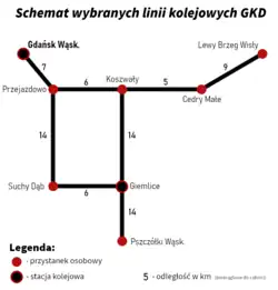 8 września 1996 roku zawieszono ruch pasażerskich na pozostałych czynnych liniach GKD, tj. Prawy Brzeg Wisły - Sztutowo i Stegna - Nowy Dwór Gdański. Pociągi towarowe kursowały jeszcze podczas kampanii cukrowniczej 1996/97 dla Cukrowni Nowy Staw. 30.11.1996 r. odbył się pożegnalny przejazd wagonem motorowym MBxd2. Niedługo potem rozpoczął się proces likwidacji fizycznej i administracyjnej GKD.
