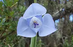 - Okwiat niebieski do fioletowego, często z białymi lub ciemniejszymi plamkami. Listki okwiatu wolne, niemal równej długości lub te w wewnętrznym okółku mniejsze. Nitki pręcików zrośnięte, główki wzniesione. Szyjka słupka smukła, rozwidlona na nitkowate lub oskrzydlone i jednostronnie spłaszczone łatki, zakończone relatywnie szerokim znamieniem i czasami malutkim grzebieniowatym wyrostkiem[5]. Na listkach okwiatu obecne są elajofory, gruczoły wydzielające tłuszcz, przyciągające pszczoły[6].