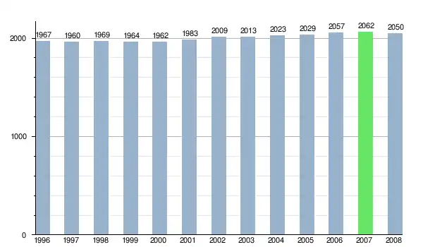 Według danych z dnia 31 grudnia 2012, wieś zamieszkiwało 2057 osób, w tym 1034 kobiety i 1023 mężczyzn[9].