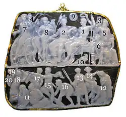 Powierzchnia gemmy podzielona jest horyzontalnie na dwie strefy dekoracji reliefowej. W górnej, ważniejszej, symbolizującej militarną władzę cesarza Oktawiana Augusta nad światem, centralne miejsce zajmuje siedzący na podwójnym krześle lub tronie (bisellium) sam cesarz (1) i bogini Roma (2). Towarzyszą im z prawej strony personifikacje: Ziemia Matka – Gaja (6), Ocean – Okeanos (5) i Świat Zamieszkany – Ojkumene (3), a z lewej postacie historyczne: młody Tyberiusz schodzący z bigi lub rydwanu (7) oraz chłopiec, zapewne młody Germanik, gotowy do następnej akcji (8). Za Tyberiuszem na rydwanie stoi bogini Wiktoria (4). Nad Augustem, na tle księżyca lub słońca widoczny jest ulubiony symbol cesarza – koziorożec (9). Dolna strefa zawiera symbolikę zwycięstwa. Grupa rzymskich żołnierzy (16, 17) ustawia trofeum (19) z pomocą boga Marsa (15), obok figurują poniżani przez Rzymian jeńcy barbarzyńscy (11) – postacie te interpretowane są niekiedy także jako bóstwa czy personifikacje, obserwujące stawianie trofeum. Obok Rzymian przedstawiony jest także sojuszniczy żołnierz macedoński (18), a także, jak się przypuszcza, personifikacja prowincji hiszpańskich (13) oraz, na co wskazuje kapelusz z szerokim rondem – petasos, personifikacja wojsk trackich (14). Na prawo od personifikacji prowincji widoczna jest inna para jeńców barbarzyńskich (12). Za Macedończykiem znajduje się tarcza wschodniego typu z rysunkiem skorpiona (20), który jako znak zodiaku symbolizuje miesiąc listopad, czyli miesiąc urodzin Augusta, a u stóp Augusta spoczywa orzeł (10), w starożytnym Rzymie symbol ojca bogów Jupitera – Jowisza (a także legionów rzymskich).