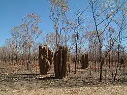 Wiecznie zielony las w północnej AustraliiSucha roślinność Australii z widocznymi kopcami termitów