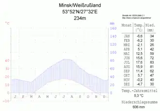 Białoruś leży w strefie klimatu umiarkowanego, względnie ciepłego w porównaniu z pozostałymi obszarami Niżu Wschodnioeuropejskiego, przejściowy między klimatem morskim a kontynentalnym. Charakterystycznymi cechami są niezbyt mroźne zimy, niezbyt upalne, ale dość wilgotne lata, deszczowe jesienie i wiosny o zmiennej pogodzie. Przeważają masy powietrza atlantyckiego, zimą masy powietrza arktycznego mogą wywołać spadki temperatur do −44 °C, latem masy powietrza zwrotnikowego przynoszą suszę i upały.