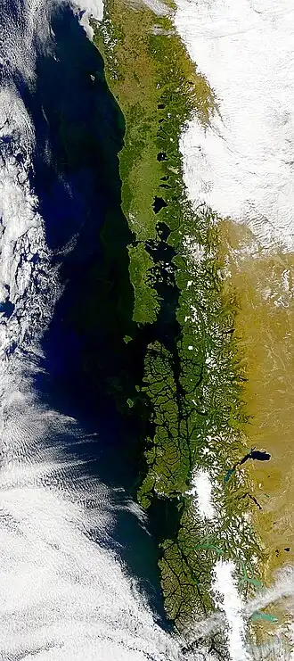 Chile południowe leżące na południe od 42°S, wyróżniają się silnym rozwinięciem linii brzegowej. Znajdują się tam najwyższe partie Kordyliery Nadbrzeżnej, a Kordyliera Główna Andyjska zbliża się do oceanu i tworzy najniższe spośród łańcuchów chilijskich Andy Patagońskie. Na kształt tamtejszej rzeźby miały i wciąż mają spływające do oceanu lodowce.