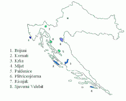 - Park Narodowy Wysp Briońskich (Narodni Park Brjuni) – znajduje się w pobliżu zachodniego wybrzeża półwyspu Istria i obejmuje dwie większe i dwanaście mniejszych wysepek.