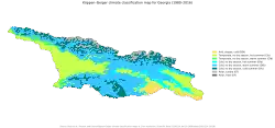 Gruzja leży w strefie klimatu podzwrotnikowego silnie zróżnicowanego m.in. z powodu urozmaiconej rzeźby terenu i łagodzącego wpływu Morza Czarnego[4]. Przez grzbiet Wielkiego Kaukazu przebiega granica dwóch stref klimatycznych: umiarkowanej ciepłej i podzwrotnikowej, w której znajduje się właśnie Gruzja. Występuje piętrowość klimatyczna[4], co oznacza, że temperatury, a tym samym przebieg pór roku w górach jest inny niż w dolinach.