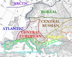 Gatunki klasyfikowane jako wschodnie potrzebują więcej światła słonecznego, mniej wilgoci i znoszą ciężkie zimy. Występują one przede wszystkim na południowym wschodzie i w głębi lądu. Są to np. wawrzynek wilczełyko, poziomka twardawa i przetacznik kłosowy. Niektóre z tych gatunków występują powszechnie na Syberii. Są też gatunki umiarkowane, nie klasyfikujące się do dwóch poprzednich grup, występują one przede wszystkim na południu jak np. dąb, jesion czy szczyr trwały.