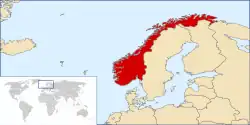 Norwegia leży w Europie Północnej, zajmując zachodnią i północną część Półwyspu Skandynawskiego[1]. Do Królestwa Norwegii oprócz części kontynentalnej (norw. Hovedland) należą również archipelag Svalbard i wyspa Jan Mayen na północnym Atlantyku[1]. Terytoria zależne Norwegii (norw. Biland) to: Wyspa Bouveta na południowym Atlantyku, a także antarktyczna Wyspa Piotra I na Morzu Bellingshausena i Ziemia Królowej Maud na Antarktydzie[1].
