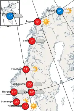 Średnia miesięczna temperatura waha się od −17,1 °C w styczniu w Karasjok (129 m n.p.m.)[15] do 17,3 °C w lipcu w Oslo-Studenterlunden (15 m n.p.m.)[16]. Najwyższa średnia roczna temperatura wynosi 7,7 °C w Skudeneshavn, a najniższa −3,1 °C w Sihcajarvi (pomijając wyższe góry i Svalbard); to daje różnicę 10,8 °C między tymi miejscowościami. Taka sama różnica występuje między Skudeneshavn a Atenami[17].