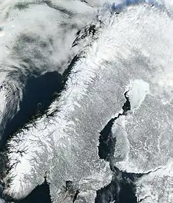 Wzdłuż wybrzeża zimy są znacznie łagodniejsze niż w głębi lądu. Różnica temperatur między najcieplejszym a najzimniejszym miesiącem wynosi jedynie 11–15 °C. W Herøy amplituda wynosi 10 °C przy najniższej temperaturze równej 2,7 °C[14]. Amplituda w głębi lądu jest większa, dochodzi nawet do 30 °C w Karasjok. Najchłodniejsze zimy występują w Finnmarksvidda na północy, jednak także na południu zdarzają się bardzo niskie temperatury, np. w Røros zanotowano –50 °C, a w Tynset średnia temperatura stycznia wynosi –13 °C.