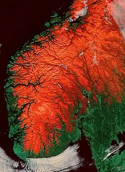 Norwegia leży na tarczy fennoskandzkiej zbudowanej głównie z granitu i innych skał powstałych 1–2 miliardy lat temu[6]. Krajobraz został ukształtowany przez procesy erozyjne i glacjalne – cechą charakterystyczną są rozległe penepleny[6]. Hardangervidda w południowo-zachodniej części kraju jest największą penepleną w Europie[7].