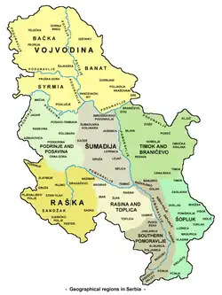 Kraj podzielony jest na dwa obszary krajobrazowe nizinną północ, gdzie udział terenów nizinnych stanowi niecałe 30% i wyżynno-górzyste południe wraz z centrum kraju. Jeśli weźmie się pod uwagę terytorium Kosowa, w Serbii udział terenów wysoko położonych, czyli gór i wyżyn wynosi nieco ponad 70% powierzchni kraju.