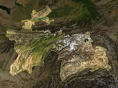 Tadżykistan jest krajem o dość osobliwym konturze granic. Składa się z dwóch części. Główna część jest długa na około 650 km i szeroka w centralnym, natomiast w najwęższym miejscu na około 110 km. Druga część kraju, na północy wcina się między Kirgistan i Uzbekistan i jest długa na mniej więcej 200 km i szeroka na 50 km.