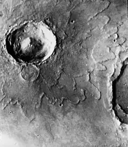 - ↑ Strom, R.G.; Croft, S.K.; Barlow, N.G. (1992). „The Martian Impact Cratering Record”. In Kieffer, H.H.; Jakosky, B.M.; Snyder, C.W.; et al. Mars. Tucson: University of Arizona Press. s. 384–385.