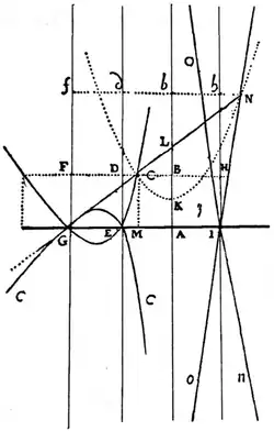 - Kartezjusz najpierw zauważył, że równanie krzywej będzie musiało mieć dwie niewiadome, ponieważ muszą związać ze sobą punkt na prostej z punktem na krzywej[25]