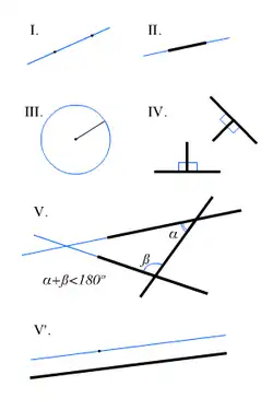 - Dwie proste, które przecinają trzecią w taki sposób, że suma kątów wewnętrznych po jednej stronie jest mniejsza od dwóch kątów prostych, przetną się z tej właśnie strony.