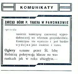 - ↑ Josef Dornhof, Landeshauptmann a. D. Dr. von Thaer, Herr auf Pawonkau – ein hochverdienter deutscher Staatsdiener, w: Loben-Guttentager Kreisblatt, 22 marca 1973, Nr 4, rocznik 18.