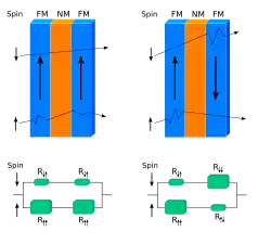 Modelowo układ ten można przedstawić jako zespół oporników połączonych równolegle, co przedstawiono na rysunku 2. Całkowity opór takiego układu jest zdeterminowany tylko przez opór elektronu ze spinem ↑, czyli jest mały. Dla konfiguracji antyrównoległej (↑↓) prawdopodobieństwo rozpraszania elektronów dla obu spinów jest równe. Elektron ze spinem ↓ jest słabo rozpraszany na pierwszej warstwie i silnie rozpraszany na drugiej, natomiast elektron ze spinem ↑ jest rozpraszany odwrotnie. Każdy kanał może być reprezentowany przez jeden mały i jeden duży opornik. W rezultacie całkowity opór dla konfiguracji antyrównoległej jest większy niż dla konfiguracji równoległej. Reasumując, jeśli zewnętrznym polem magnetycznym wywołana zostanie zmiana względnych kierunków namagnesowania, przechodząc od konfiguracji ↑↓ do konfiguracji ↑↑, to wystąpi efekt zmniejszenia oporu, czyli zjawisko GMR[3].
