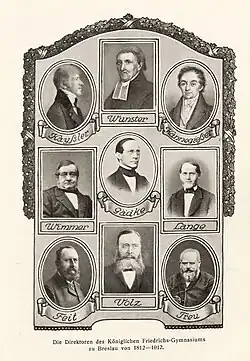 - ↑ Edukacja przede wszystkim. Dawne Gimnazjum Fryderyka II. Fotospacer. [online], Radio Wrocław, 29 kwietnia 2021 [dostęp 2024-06-20] (pol.).