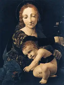 W Madonnie z Dzieciątkiem widać wyraźnie wpływy Leonarda da Vinci. Prawdopodobnie został on namalowany na podstawie szkiców samego mistrza. Świadczyć o tym może kompozycja, szczególnie odnośnie do postaw Dziecka i Dziewicy, których ruchy są skoordynowane, pomimo wrażenia chaotycznego ruchu. Na obrazie umieszczone zostały symbole ikonografii religijnej. Sukienka Dziewicy, przedstawiona z wielkim realizmem, przyozdobiona jest motywami kwiatów. Widoczny oset jest symbolem bólu, grzechu i męki Chrystusa. Inny kwiat – jaśmin, umieszczony blisko ręki Mary, jest tradycyjnie uznawany za symbol bożej miłości i wizerunkiem Matki Boskiej. Tego typu zestawienia symboli może nawiązywać jako aluzja do ofiary Chrystusa. Smutna postać dziewicy i świadome spojrzenie dziecka może potwierdzać to przypuszczenie. Tego typu obrazy o wymownej symbolice są charakterystyczne dla szkoły Leonarda i jego uczniów.