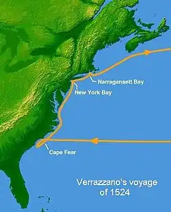 Verrazzano opuścił Maderę 17 stycznia 1524 roku i dotarł do Przylądka Strachu, odkrytego rok wcześniej przez Lucasa Vazqueza de Ayllona. Stamtąd skierował się na północ i płynąc wzdłuż wybrzeża dotarł aż do Nowej Fundlandii. W czasie swej podróży dokonał kilku przystanków, między innymi w miejscu, gdzie dziś znajduje się miasto Nowy Jork. Cieśnina, w której zarzucił kotwicę, została nazwana jego imieniem. Także współcześnie jeden z mostów w Nowym Jorku, Verrazzano-Narrows Bridge, nosi jego imię.