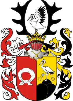 Na hełmie w koronie, klejnot – żuraw w barwach naturalnych, z uniesionymi skrzydłami, między dwoma rogami łosia czarnymi.