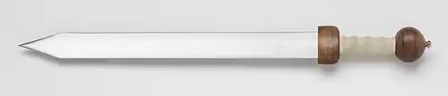 Miał obosieczną żelazną głownię z ością poprowadzoną przez środek i ostro zarysowanym sztychem. Początkowo głownia lekko rozszerzała się w kierunku sztychu (podobnie jak w greckim xiphos), późniejsze egzemplarze mają głownie równoległe, z ością po obu stronach. Mało wydatny, pudełkowaty, owalny jelec; rękojeść wieloboczna z kilkoma wcięciami dającymi lepszy chwyt; głowica na ogół kulista i spłaszczona. Elementy te, wykonywane zazwyczaj z twardego drewna lub kości, uzupełniane były nierzadko metalowymi okuciami dla ozdoby. Jelec, trzon rękojeści i głowicę montowano na trzonie głowni[1].