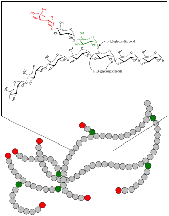 Kolor szary – reszty glukozy połączone wiązaniami α-1,4-glikozydowymi; kolor zielony – reszty glukozy przyłączone w punktach rozgałęzienia wiązaniami α-1,6-glikozydowymi; kolor czerwony – skrajne reszty glukozy, od których zaczyna się degradacja glikogenu podczas glikogenolizy