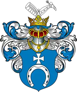W polu błękitnym podkowa srebrna z takimż krzyżem kawalerskim na barku. Klejnot: nad hełmem w koronie noga zbrojna wsparta na kolanie. Labry błękitne+, podbite srebrem.