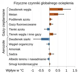 W roku 2019 wymuszenie radiacyjne wynikające ze wzrostu koncentracji dwutlenku węgla, metanu i podtlenku azotu z poziomu przedindustrialnego wynosiło 2,09, 0,62 i 0,2 W/m², odpowiednio[38], a całkowite wymuszenie radiacyjne antropogenicznych gazów cieplarnianych przekroczyło 3,25 W/m².