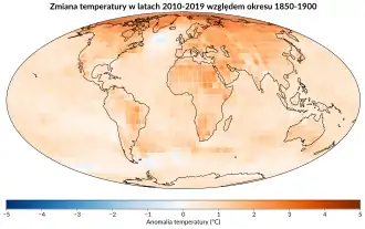 Na podstawie pomiarów instrumentalnych ustalono, że średnia globalna temperatura lądów i oceanów była pod koniec drugiej dekady XXI w. wyższa o około 1 °C od poziomu przedindustrialnego[11]. Pomiary temperatury w dolnej troposferze wykonywane przez radiosondy i radiometry satelitarne wskazują, że tempo ocieplenia od roku 1979 wynosiło około 0,18 °C na dekadę[12]. Rekonstrukcje klimatu pokazują, że przed XX-wiecznym ociepleniem temperatura była relatywnie stabilna przez ostatnie 1–2 tys. lat; wyjątkiem były regionalne oscylacje, takie jak średniowieczne optimum klimatyczne czy mała epoka lodowa.