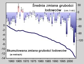 Na podstawie zdjęć satelitarnych naukowcy oszacowali, że w latach 2000–2019 masa lodowców średnio zmniejszała się o około 267 mld ton rocznie a tempo ubytku powiększało się o około 48 mld ton na dekadę[79].
