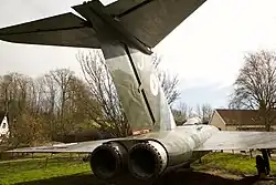 Usterzenie w układzie T – ukośny statecznik poziomy ze sterem wysokości znajdował się na szczycie statecznika pionowego. Sylwetka samolotu wyróżniała się szerokim skośnym statecznikiem pionowym o dużej powierzchni (skos przedniej krawędzi 47,6° i tylnej 42,8°)[21]. Początkowo ster wysokości tworzyły lotki ze wspomaganym hydraulicznie wychylaniem, od wersji Mk 4 zastosowano ster płytowy z napędem elektrycznym (lotki pozostały jako wyważenie)[21].