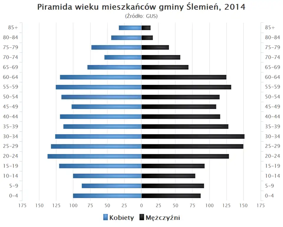 - Piramida wieku mieszkańców gminy Ślemień w 2014 roku[1].